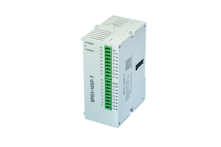 ماژول SPD1-16SP-T دارای 8 ورودی و 8 خروجی ترانزیستوری است. تفاوت خروجیهای رلهای و ترانزیستوری در این است که PLCهای با خروجی رلهای (R) جریان نامی کنتاکتهای رله VDC/309A48 و VAC/109SA220 و در خروجیهای ترانزیستوری (T) جریان نامی 0.39A با ولتاژ کاری 30-SVDC میباشد.